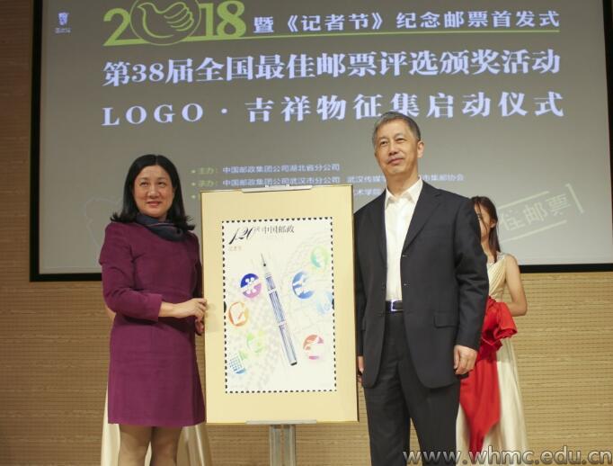 随后,我校播音与主持艺术专业学生带来了朗诵《承继·出发》。学生们深情朗诵了人民日报社战地记者焦翔、中央电视台西藏站站长陈琴、今日女报社残疾记者谭里和坚忍不拔行走在新闻一线的故事,在“记者节”这一特殊的日子表达对他们的敬意。最后,武汉集邮协会叶会长和常务副校长宗微共同上台为记者节邮票首发揭幕。据介绍,这是首次发行记者节纪念邮票。纪念邮票中间是一支笔,旁边配有信签纸、麦克风、摄像机、照相机、演播车等与新闻相关的元素。
