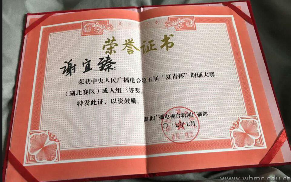 武传新闻网讯(文/记者 曹浩)日前,从播音主持艺术学院获悉,在第五届“夏青杯”朗诵大赛湖北赛区中,我校2016级播音与主持艺术专业学生谢宜臻荣获成年组三等奖。