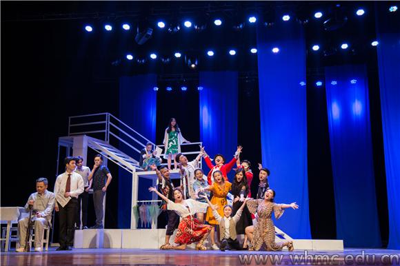 据了解,整场话剧不同风格的歌舞共有8种,牛仔、吉他手、红裙舞女轮番上场,演员们蹦蹦跳跳,让欢乐填满了整个大厅。导演于昊介绍,歌舞戏相结合,让话剧形式更为丰富,能全面展示学生的能力,也让学生们明白,形体对于一个演员的重要性。