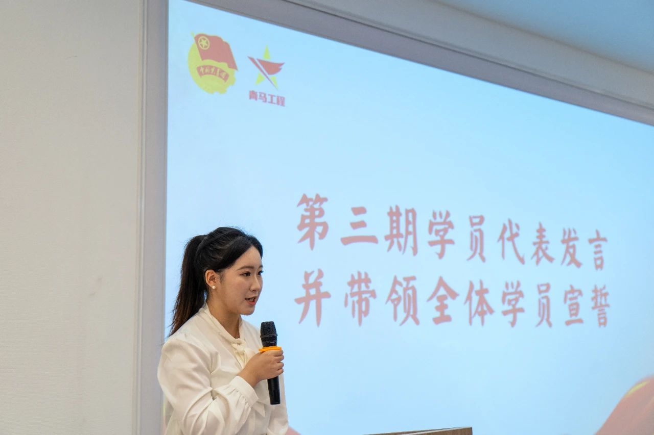 第三期学员代表、播音主持艺术学院学生张韵雅在发言中号召全体学员筑牢信仰之基、练就过硬本领、践行初心使命,争做新时代青年马克思主义者。在领誓人带领下,56 名新学员面向团旗庄严宣誓:“珍惜学习机会,坚定理想信念,勇担历史重任,以青春之名立鸿鹄之志!”
