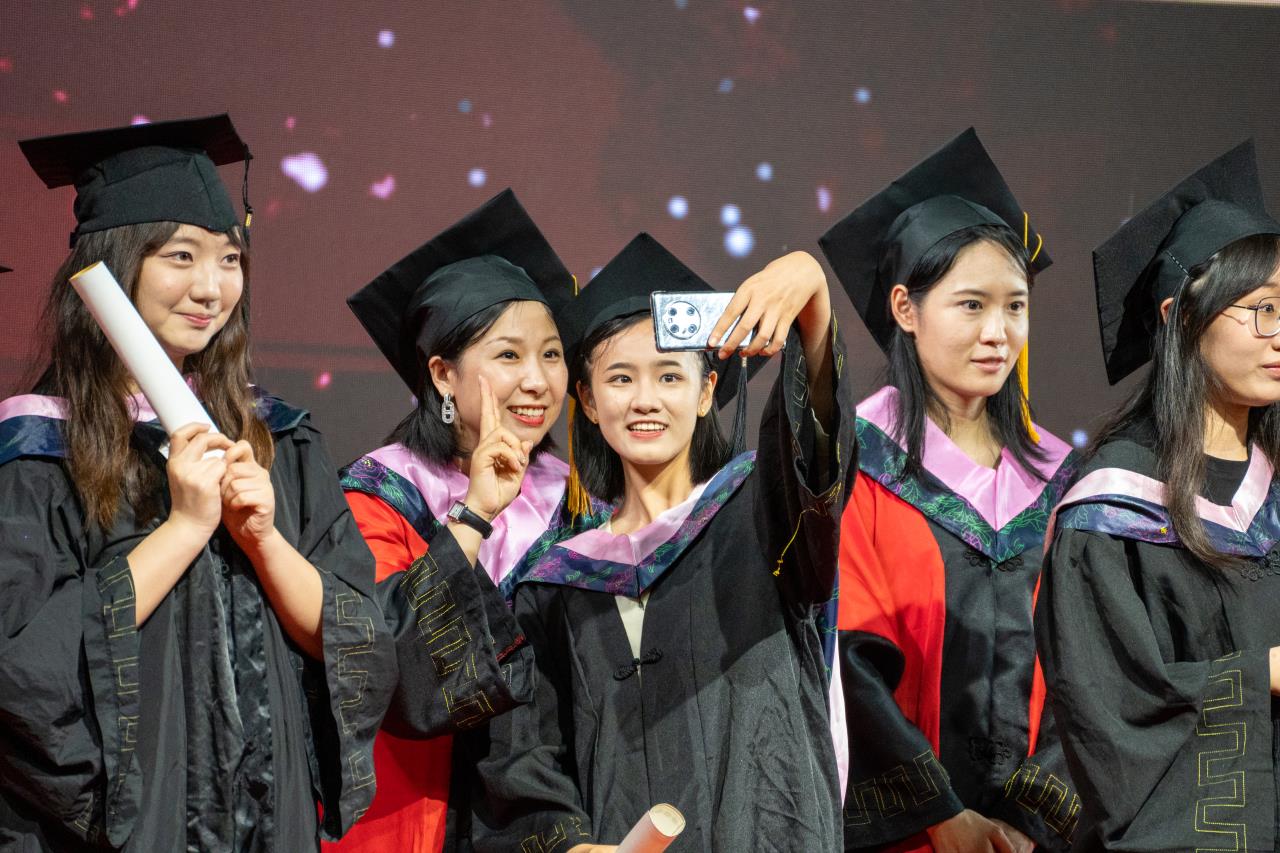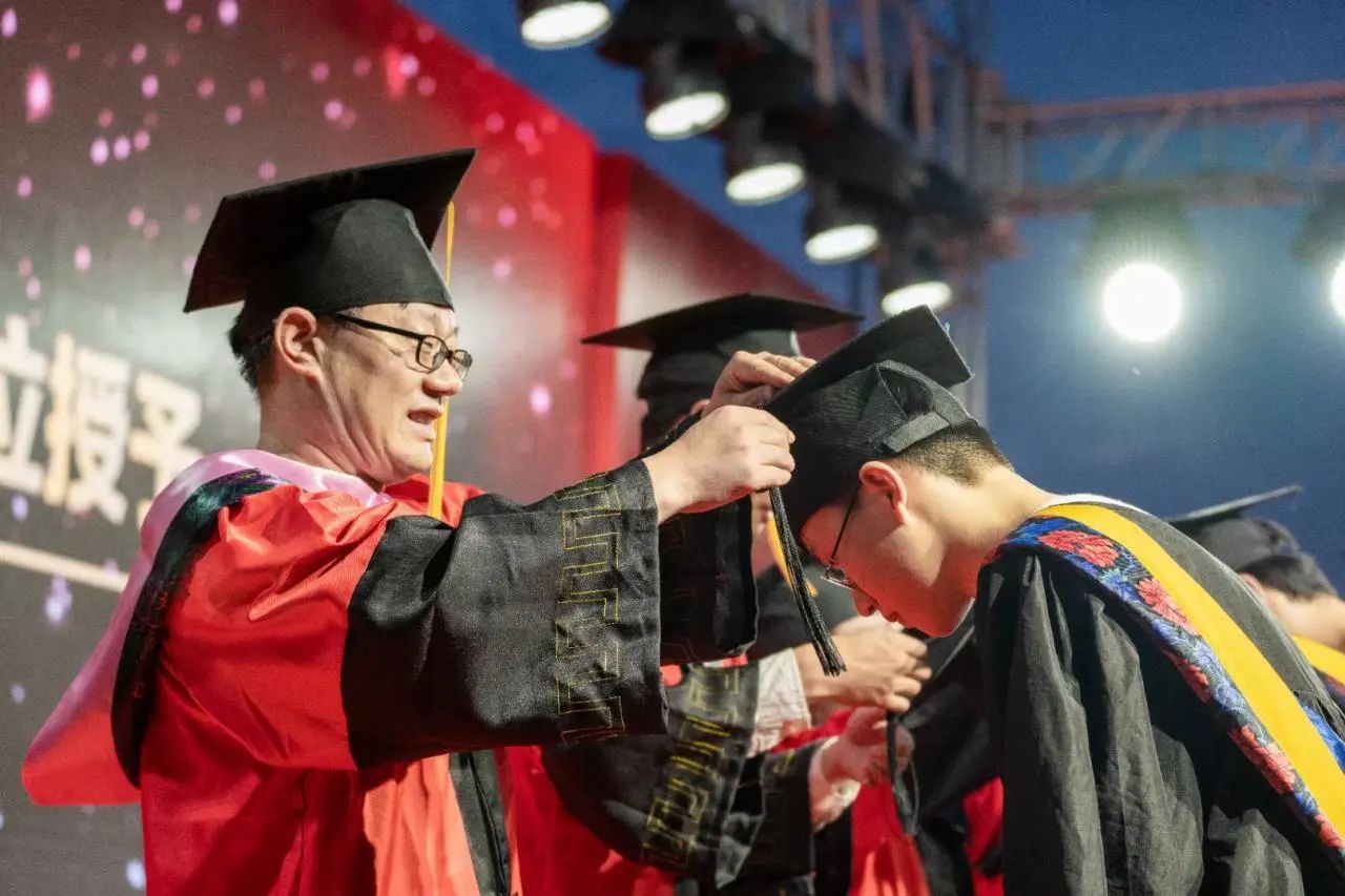 节目之后,学校举行了学位授予仪式,校领导、学院教授们用了1个多小时时间,为2648名毕业生颁发学位证书,并为他们逐一拨穗、授予学位、合影留念。