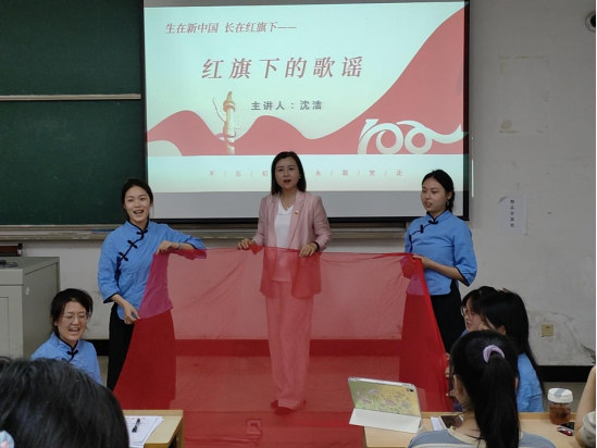 针对预备党员和党员,沈洁老师以“生在新中国,长在红旗下——红旗下的歌谣”为主题,向同学们展示了一首首振奋人心的红色经典歌谣,讲述了每一首歌曲所反映的时代背景。以歌谣为线索,带领同学们深入了解了抗日战争、解放战争等时期的主要矛盾和主要任务。让同学们对《团结就是力量》《中国人民解放军进行曲》《绣红旗》等优秀作品有了更深入的了解。