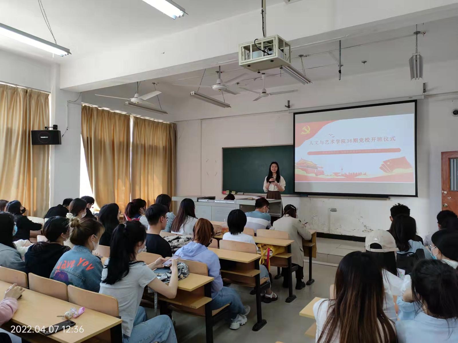 2022年4月7日中午,人文与艺术学院分党校36期开班式在2405教室举行,人文与艺术学院党总支部副书记吴斌、人文与艺术学院党总支部组织委员荣金玉出席了开班典礼,本次开班式由党员服务站成员王函之同学主持。