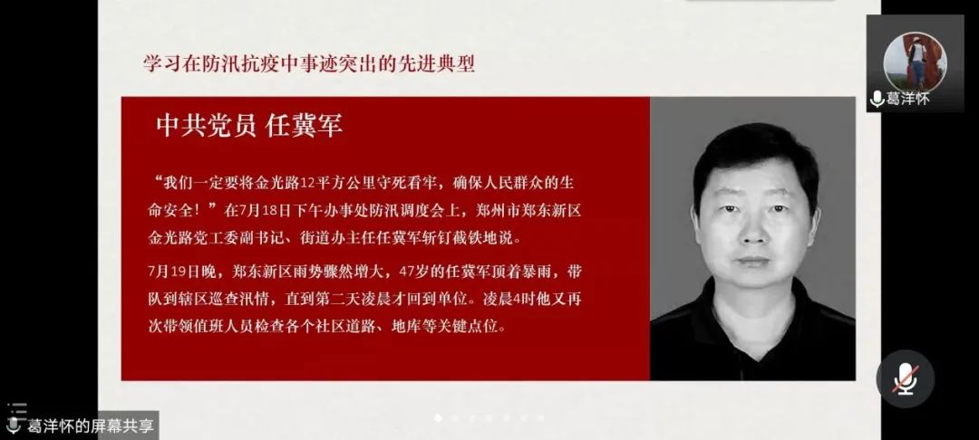 葛洋怀同志带领全体同志共同学习了在防汛抗疫中事迹突出的先进典型。包括“不相信有完不成的任务,不相信有克服不了的困难,不相信有战胜不了的敌人”,“三个不相信”精神的杨根思连;英勇奋战在防汛一线的郑州市郑东新区金光路党工委副书记、街道办主任中共党员任冀军和金光路街道办事处党政主任“拼命三郎”“工作狂”翟向以及巩义市米北村第13村民组组长马新喜等等;在抗疫一线奔波的张家界市公安局交警支队一大队民警杜汉明,还包括就发生在我们身边的,崇阳县石西庄村党支部书记代低归背着独居老人打疫苗的感人场景。