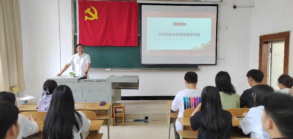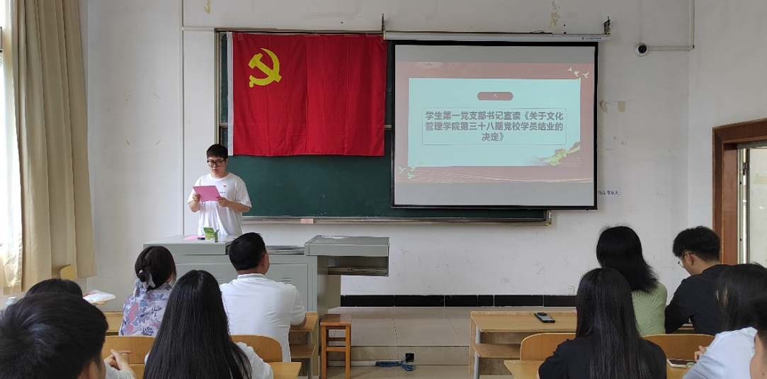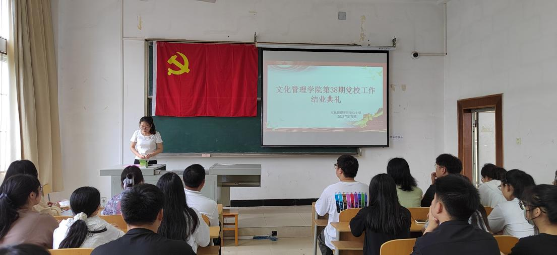 为弘扬百年党史,争做时代新人。落实党的二十大精神,为党组织选拔、培养、输送优秀青年,5月5日中午,文化管理学院分党校第三十八期党校工作结业式在5204教室举行。文化管理学院党总支部书记、分党校校长张爱军,学生第一党支部书记王喆,学生第二党支部书记陈可冉, 党总支部组织委员武思雨, 团委书记汪丰毅,优秀教工党员代表袁知兰出席本次结业典礼。