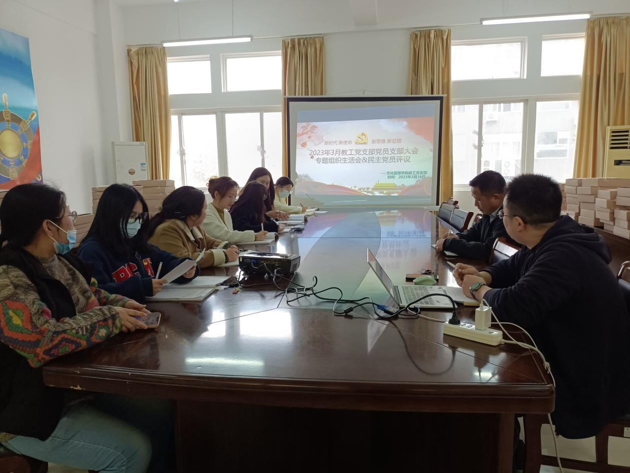 2023年3月16日上午,文化管理学院教工党支部、学生第一党支部、学生第二党支部同时召开2022年度组织生活会暨民主党员评议活动。会议分别由教工党支部书记蒋冬青、学生第一党支部书记王喆、学生第二党支部书记陈可冉主持,文化管理学院党总支部全体党员均参加了此次会议。
