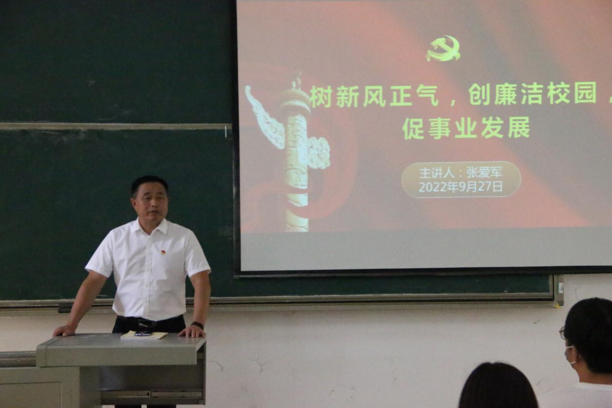 为深入学习促进清廉武传建设,推动全校党员干部以优良作风奋进新征程、建功新时代,为学校健康发展营造风清气正的良好政治生态,文化管理学院党总支部书记张爱军于2022年9月27日中午12点在5204教室给全体党员上了党风廉政建设专题党课:树新风正气,创廉洁校园,促事业发展。