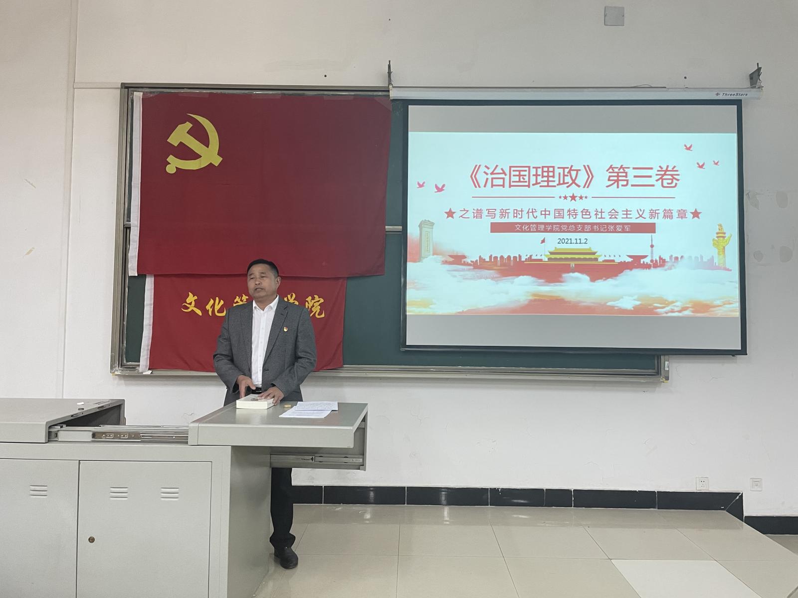 为了深入学习《习近平谈治国理政》第三卷,文化管理学院党总支部于2021年11月2日晚17点30分在5204教室开展了《习近平谈治国理政》第三卷之新时代中国特色社会主义新篇章主题党课,本次党课由文化管理学院党总支部书记张爱军主讲,文化管理学院学生第一支部书记王喆、学生第二支部书记陈可冉以及党校预备党员、发展对象、入党积极分子参加了本次党课培训。