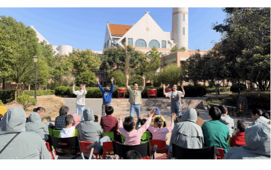 在儿童福利院的小广场,以天为幕,以地为台,同学们为孩子们表演了原创音乐课本剧《卖报童》,该剧由沈洁老师指导学生创编,以小学音乐课本为基础,以武汉小报童为历史原型,运用奥尔夫乐器、歌唱、舞蹈律动、声势律动等音乐元素表现报童们在艰苦的条件下携手同行、互帮互助的情景,塑造天真活泼的报童形象,反映旧社会报童不幸的童年生活,又表现了他们积极向上、对光明的未来充满希望的乐观主义精神。现场同学们的演出真情投入,获得了孩子们的热烈欢呼和掌声,还有孩子情不自禁地走上前去跟同学们一起舞蹈,沉浸在快乐和幸福中。用音乐讲好中国故事,展演红色课本剧,与福利院的孩子们一起重温经典,感受生命的力量。