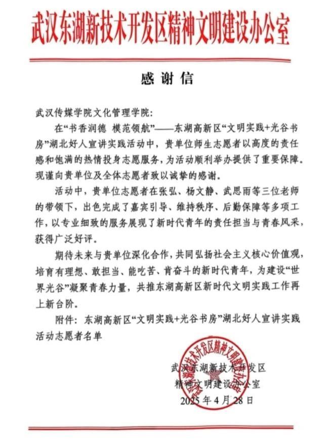 此次志愿服务获得东湖高新区文明办的高度认可,并专门发来感谢信。信中特别提到,在张弘、杨文静、武思雨三位教师的带领下,志愿者团队自活动筹备阶段便深度参与,以高度的责任感和饱满的热情完成各项任务,从活动策划到现场执行全程高效协作,为活动的圆满举办提供了坚实保障,充分彰显了新时代青年的责任担当与青春风采。