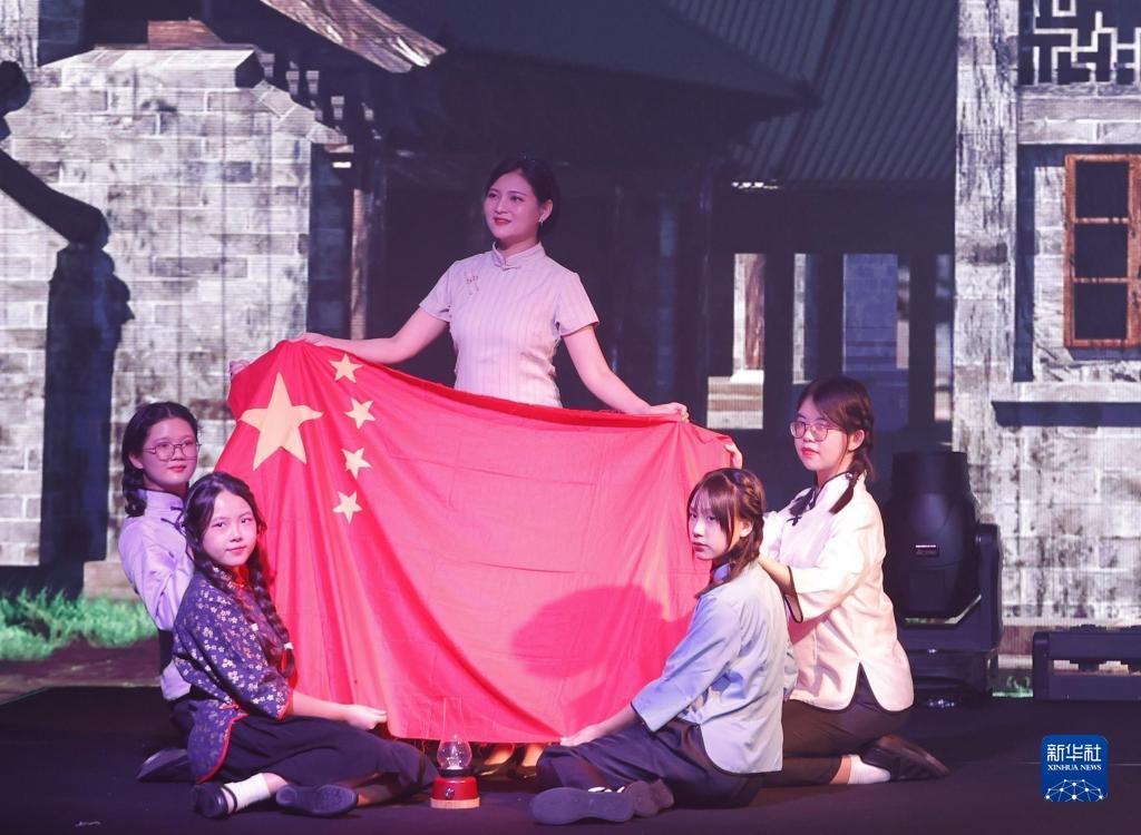 9月25日,演员演出以澳门升起第一面五星红旗的真实故事为蓝本改编的短剧《五星红旗》。新华社发