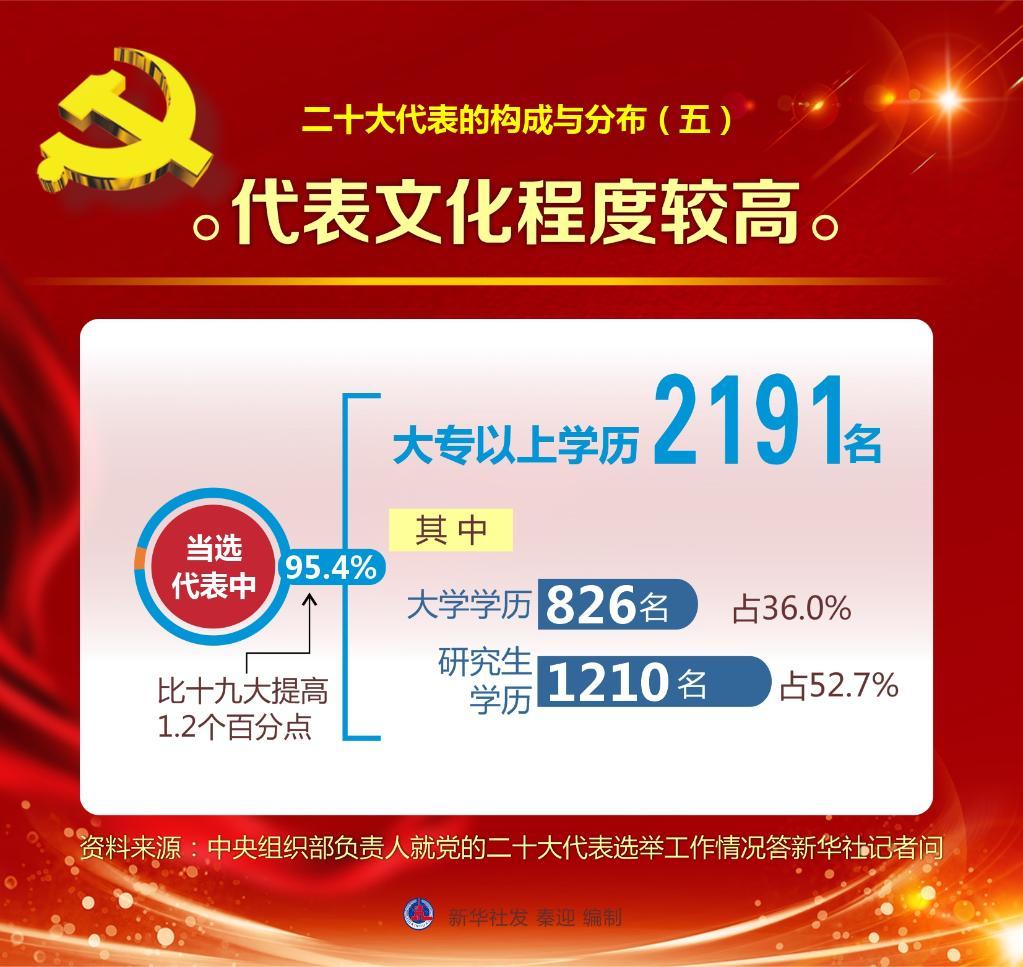 五是代表文化程度较高。当选代表中,大专以上学历的2191名,占95.4%,比十九大提高1.2个百分点。其中,大学学历的826名,占36.0%;研究生学历的1210名,占52.7%。