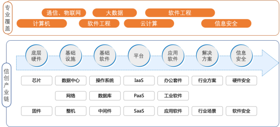 如下图所示,由于信创产业链覆盖底层硬件、基础设施、基础软件、平台、应用软件、系统集成和信息安全等环节,因此与传统诸如“物联网”一个专业对应一个行业不同,信创人才培养是基于“信创+X”的逻辑,X是常规专业,例如信创+大数据专业,培养具有“自主可控大数据系统”的推广、部署、运维、设计或研发能力的人才。