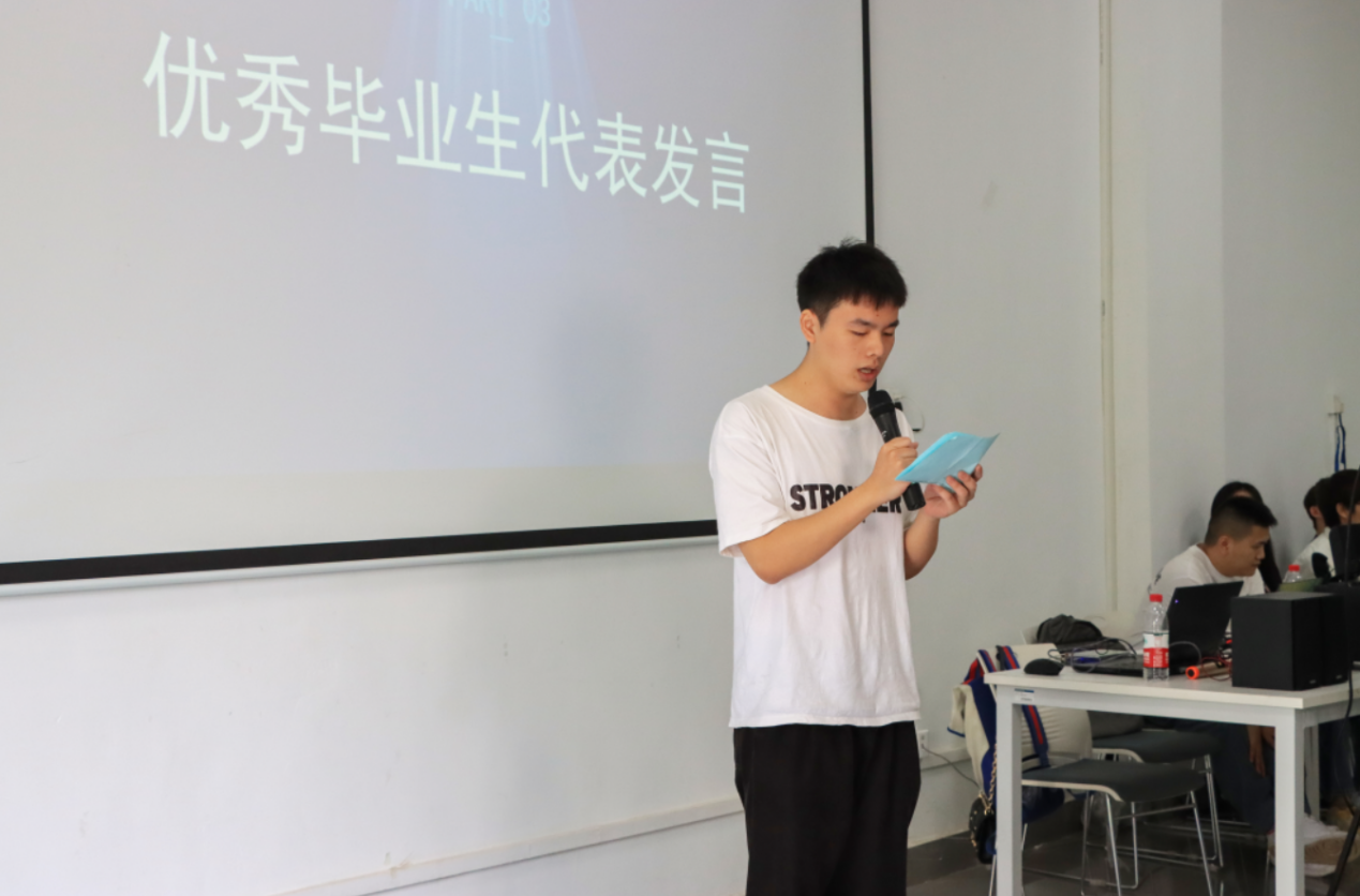 开幕式第三项,电子信息工程B1901班叶罡同学作为第七届毕业作品展优秀学生代表发言。叶罡同学对母校、恩师的不舍溢于言表,他向同学们介绍自己毕设作品的制作历程,四年光阴,每一秒都让他受益匪浅。“只有通过不断地思考和探索,才能完成一个较为满意的作品”,叶罡同学向大家认真阐述道。