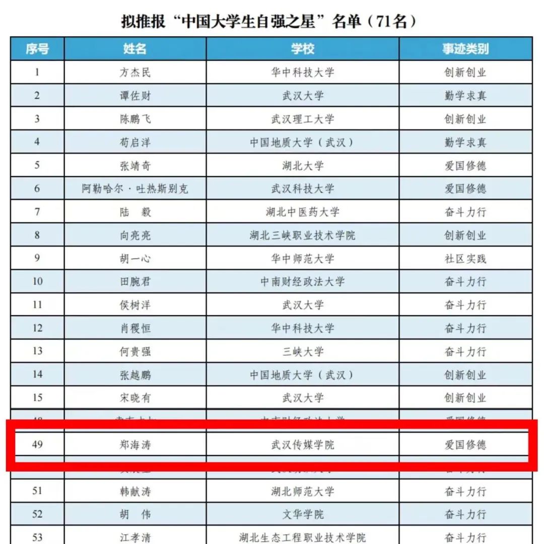 郑海涛同学获得国家奖学金、大艺节一等奖、新闻采编三等奖,积极参与各类志愿服务累计时长900小时+、带领团队开展“三下乡”暑期社会实践获湖北省优秀实践团队、作为湖北省教育厅下发的”百校联百县”项目学生负责人。