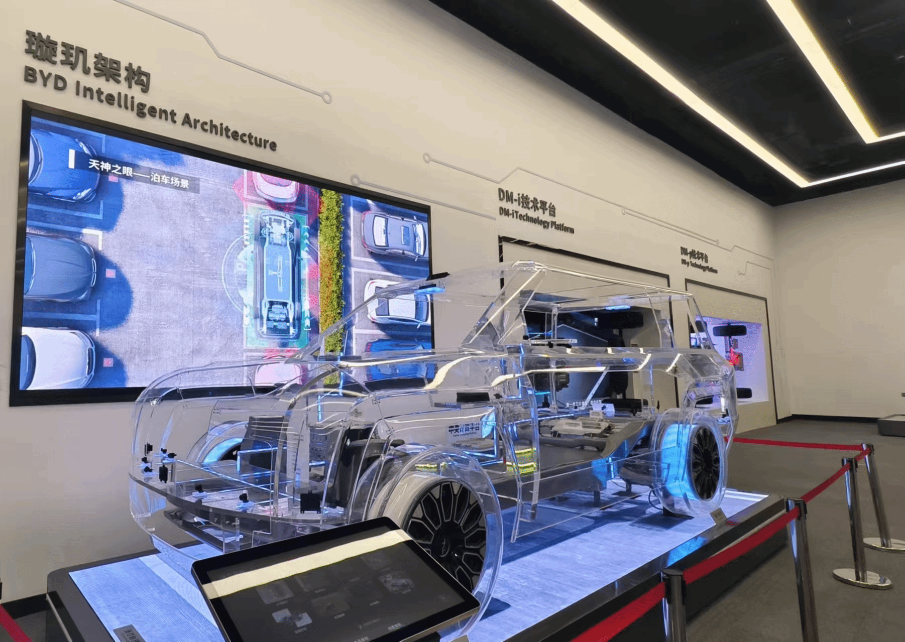 在极具现代科技感的展厅中,我校考察团成员感受到了前沿科技所带来的震撼。通过“技术为王,创新为本”八个大字感受到了比亚迪精神的内核,以及从专利墙到工匠墙再到刀片电池、DM技术、e平台技术、易四方、云辇等多项技术展示部分,深入了解比亚迪在新能源汽车领域的科技创新、可持续发展战略和全球布局。