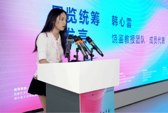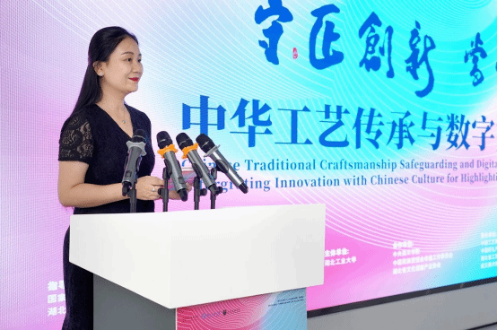策展团队代表韩心雲同学表示,团队在总策展人饶鉴教授的带领下,精诚合作,力求在细节上完美呈现中华传统工艺的“守正”与“创新”。她说,此次展览从“工艺解构”“工艺再造”“工艺活化”三个主题出发,展出中华工艺传承与再造作品。她还向参加开幕仪式的各位嘉宾详细讲解了此次展览的展区设计情况,并向支持此次展览的全体工作人员及承办单位表示衷心感谢,并希望通过举办此次展览,能在延续中华历史文脉、推动中华优秀传统文化的创新性发展上起到积极的推动作用,让更多的人感受到中华文化的魅力,激发全社会对中华文化传承与创新的关注。