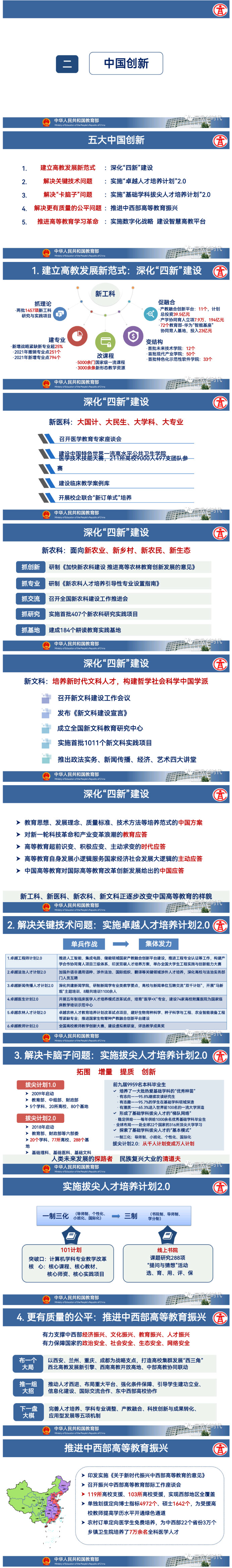 中国高等教育改革有很多创新发展的举措,其中有五大创新是非常重要的。一是高等教育发展范式的创新。我们推出了新工科、新医科、新农科、新文科建设;二是解决“卡脖子”的关键人才培养问题,就是关键技术人才培养的问题。我们实施了“卓越人才培养计划”2.0;三是要解决“卡脑子”的关键人才培养问题,就是科学原创人才培养的问题。我们实施了“基础学科拔尖人才培养计划”2.0;四是要解决更有质量的公平问题。推进中西部高等教育振兴,就是解决区域之间的协调发展;五是要推进高等教育学习革命。3月份教育部推出了国家高等教育智慧平台,实施高等教育数字化战略。