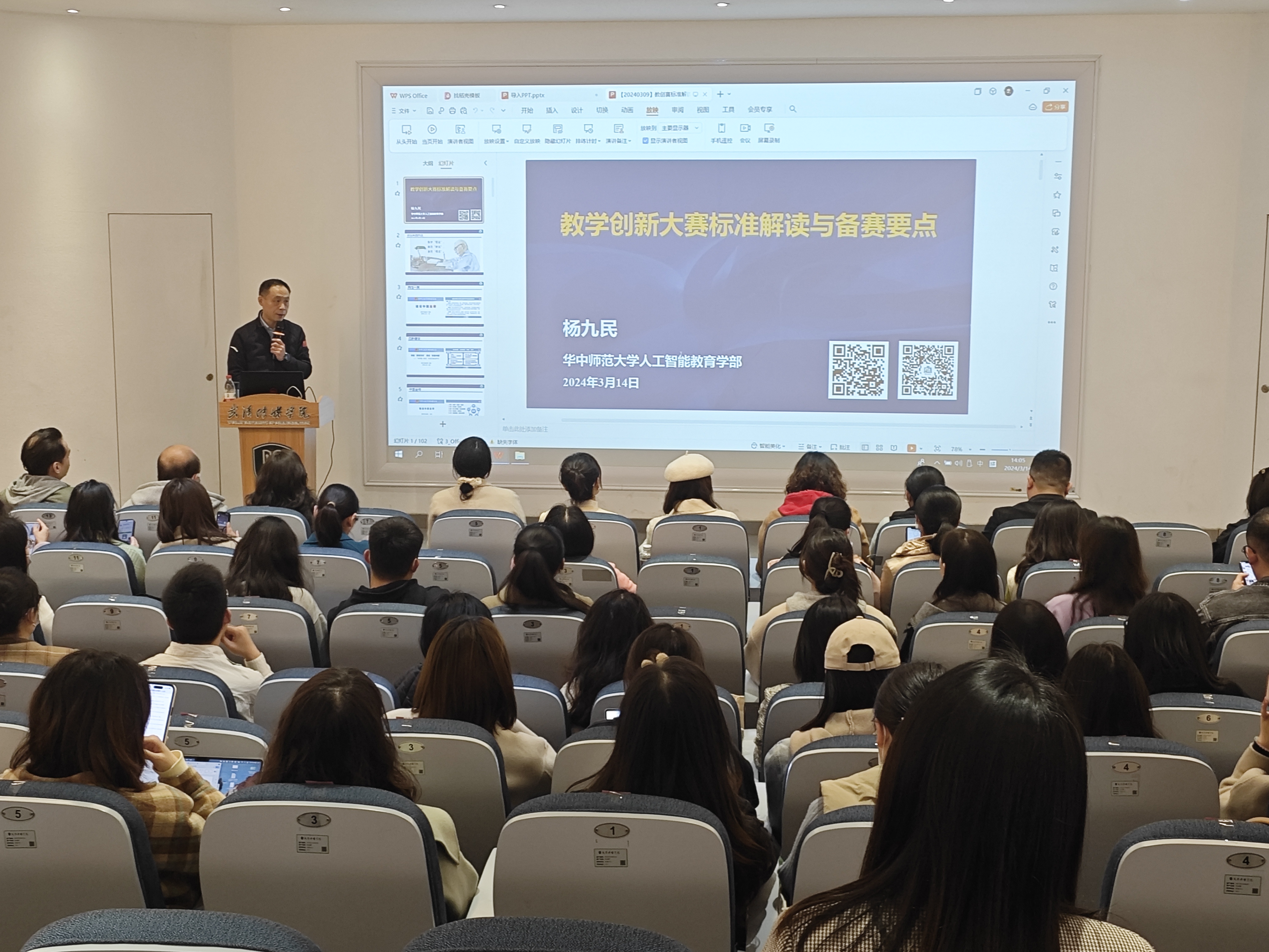 (通讯员 孟佳盈)为促进教育教学改革走向深入,助力“四新建设”,推动课程积极开展教学创新与实践,有效提高课程质量,2024年3月14日,米兰体育网页版登录教师发展中心开展了教学创新的内涵与实践路径为主题的讲座。讲座邀请博导,发展与教育心理学博士,湖北省教学名师,全国首届“明德教师奖”获得者,全国高校教师教学创新大赛国赛评委杨九民教授开展专题讲座。各学院院长、专业负责人、教师共100余人参加。